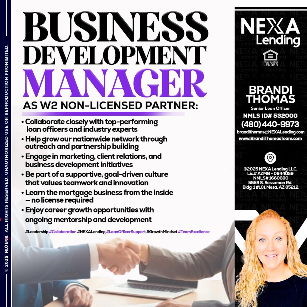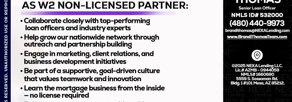 Hi, my name is Brandi Thomas Team. I’m a Loan Officer with NEXA Mortgage LLC., offering personalized mortgage solutions, fast customized quotes, great rates and service with integrity.