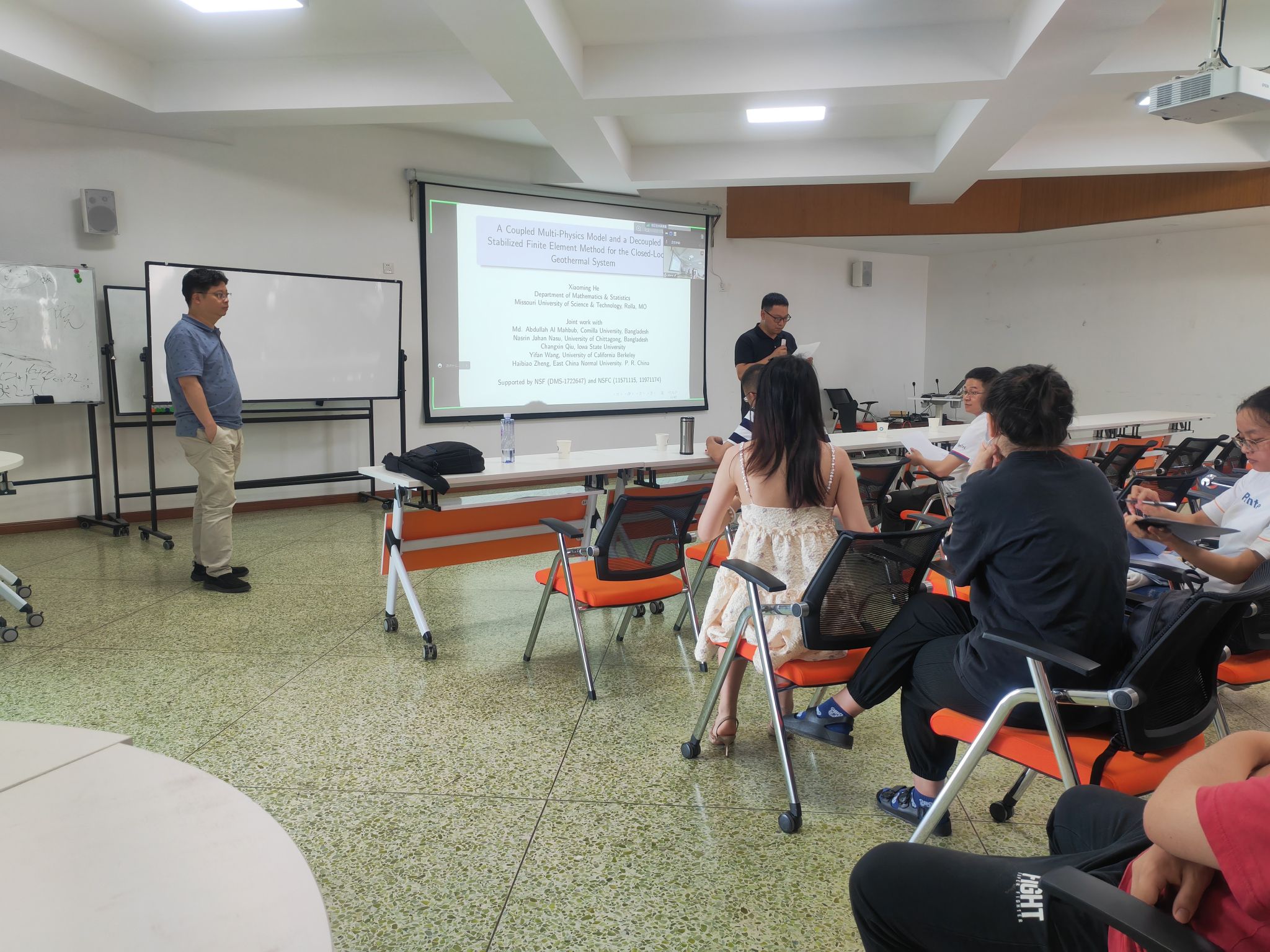何晓明授报告题目是A coupled multi-physics model and a decoupled stabilizedfinite element method for closed-loop geothermal system. 主要讨论了利用地热能在封闭环境下的水热系统的多物理耦合模型和解耦稳定有限元方法。会议上针对实际物理问题,何晓明教授使用Boussinesq方程、修正的Darcy方程等进行建模,用有限元方法解方程,做离散,做成矩阵格式,再通过解耦、显式处理、迭代计算、条件加稳定子,先做稳定分析再做收敛分析,最后使用算例验证,验证收敛等方法证明结果的正确性。何晓明教授的学术报告深入浅出,简明扼要,生动形象,深受老师和学生们的欢迎。