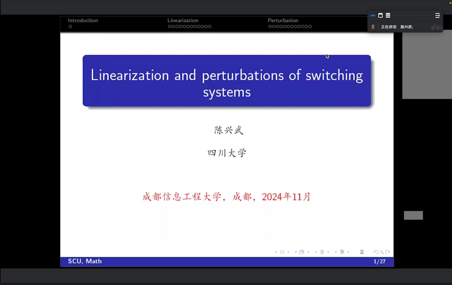 11月11日,四川大学数学学院陈兴武教授以“Linearization and Perturbations of Switching Systems”为主题,为betway必威西汉姆联带来了一场学术讲座。作为非线性动力系统研究领域的专家,陈兴武此次分享了切换系统线性化的最新研究成果,并通过实例分析了该领域中的前沿理论问题。