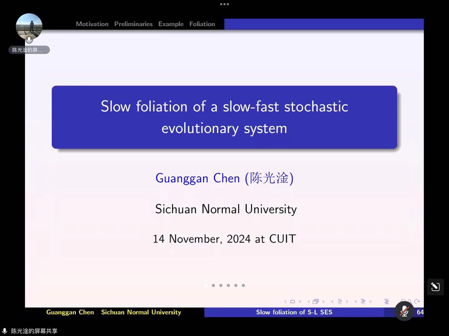 11月14日,受betway必威西汉姆联邀请,四川师范大学陈光淦教授为学院师生带来一场题为《Slow foliation of a slow–fast stochastic evolutionary system》的报告。报告由学院院长周钰谦主持。