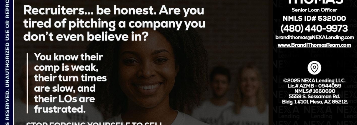 Hi, my name is Brandi Thomas Team. I’m a Loan Officer with NEXA Mortgage LLC., offering personalized mortgage solutions, fast customized quotes, great rates and service with integrity.